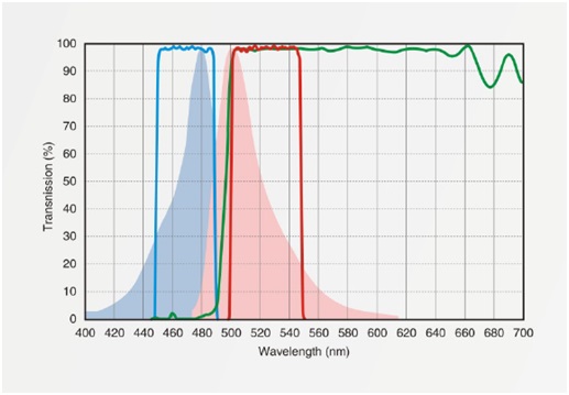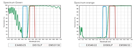 選用進口高性能熒光濾光片,光譜透過率高,并具有良好的譜線截止深度與陡度。濾片無穿色現象,具有極高的信噪比,熒光成像襯度大幅提升。濾光塊采用背景雜光消除技術,觀察時呈現圖片與背景的超高對比度,達成最佳觀察效果。