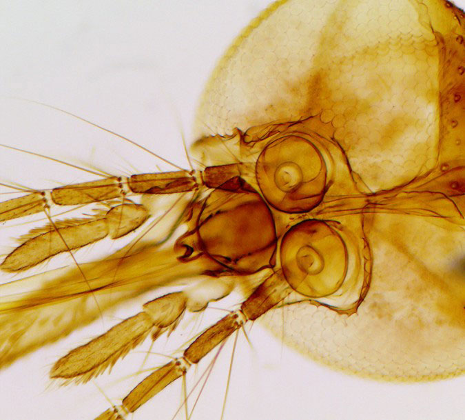 清理內臟,用解剖針在蚊子的腹部扎2-3小孔,用解剖針把內臟擠出,并清理干凈。